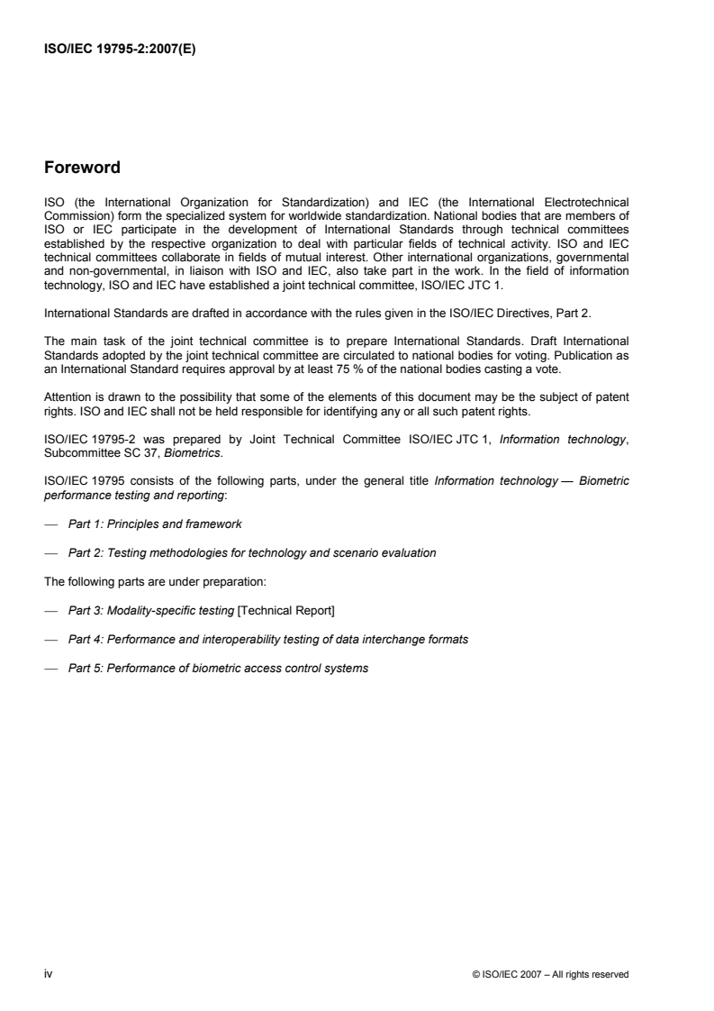 Keywords: biometric performance testing, biometric evaluation methodologies, ISO/IEC 19795-2:2007, technology evaluation, scenario evaluation, biometric algorithms, biometric sensors, test protocol.