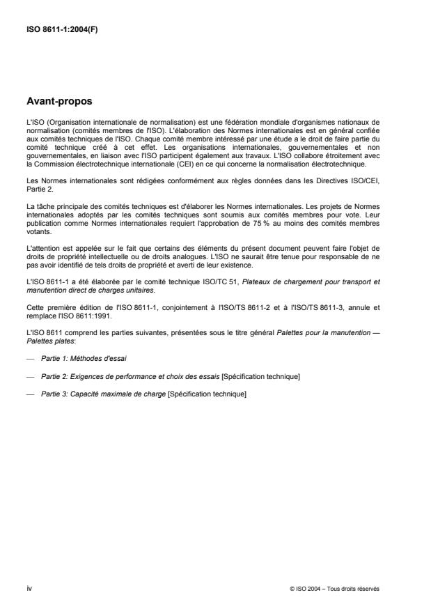 ISO 8611-1:2004 specifies test methods of existing and prototype flat pallets for materials handling for all types of use It cannot be used to evaluate a pallet to normative ISO requirements without the additional application of ISO/TS 8611-2 and ISO/TS 8611-3.