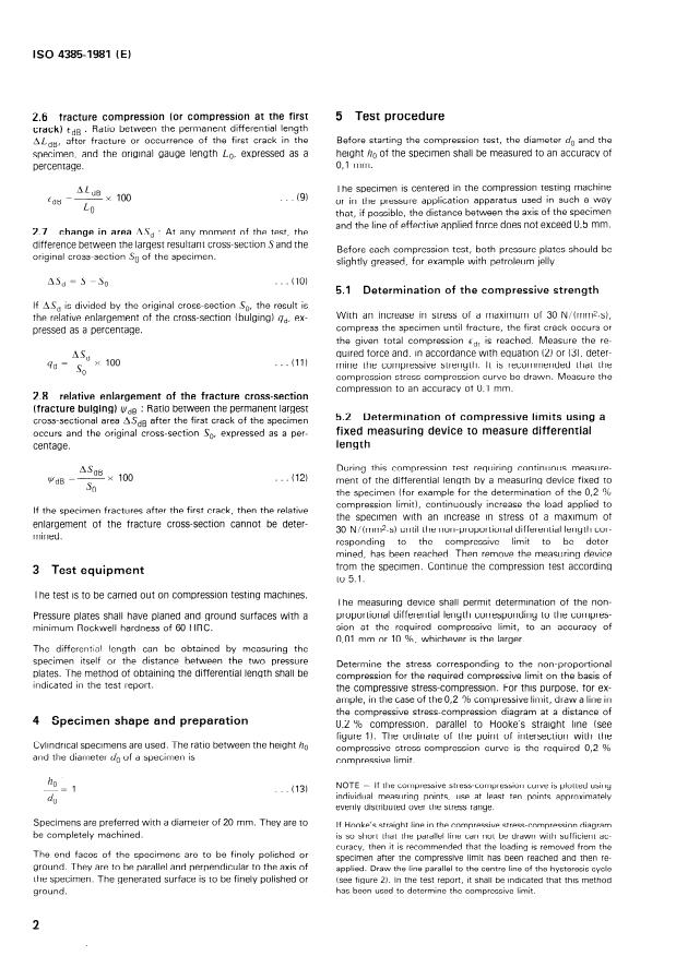 INTERNATIONAL STANDARD ISO 4385-1981 (E) Plain bearings - Compression testing of metallic bearing materials 1 Scope and field of application This International Standard specifies a method for the com- Pression testing of metallic bearing materials. Compression testing within the meaning of this International Standard serves for the determination of the behaviour of metallic materials under uniaxial compression loading which is uniformly distributed over the Cross-section. For this purpose, a cylindrical specimen with an original Cross-section So is sub- jected to compression which is slowly and continuously in- creased, and the compressive forte used is measured. 2 Definitions 2.1 compressive stress (nominal compressive stress) ad : At any moment of the compression test, the quotient of the compressive forte Fand the original Cross-section So : F . . . (1) 2.2 compressive strength adß : QUOtient of the com- pressive forte F, (which is measured when the first Crack or fracture occurs) and the original Cross-section So : FB OdB =- . . . (2) SO If no Crack occurs, the test is continued until a given total com- Pression E&. Then the compressive strength od.,. is the quo- tient of the compressive forte F corresponding to this total compression and the original Cross-section So; for example, at a given total compression of 50 % : Od!YO F50 =- . . . (3) SO NOTE - The given total compression shall not be exceeded : 50 %. 2.3 compressive limits : Quotients of the compressive forces F corresponding to a small ( < 2 %) non-proportional compression cdb or to a permanent compression ed,., and the original Cross-section So. Specially stipulated compression limits are : 2.3.1 compression limit 0,2 %, od() 2 : Limit corresponding to a non-proportional or permanent compression of 0,2 % : Od0,2 Fo,2 =- . . . SO (4) In the case of metallic materials with a continuous compressive stress-compressive curve, the 0,2 % compression limit is deter- mined instead of the compressive yield Point (see 2.4). 2.3.2 compression limit 2 %, Od2 : Limit corresponding to a non-proportional or permanent compression of 2 %. F2 Od2 CP . . . SO (5) 2.4 natura1 COmpreSSiVe yield Point OdF : Quotient Of the compressive forte F F (at which the compressive stress- compression curve begins to increase unsteadily simulta- neously with the appearance of a noticeable permanent com- Pression) and the original Cross-section So. FF OdF =- SO . . . (6) 2.5 differential length ALd : At any moment of the test, the differente between the original gauge length L. and the ac- tual gauge length L. h&-j = Lo -L . . . (7) If ALd is divided by the original gauge length Lo, the result is the compression ed which is expressed as a percentage. ALd ed =-x 100 . . . (8) LO Depending on whether it is a question of elastic, non- proportional, permanent or total compression, the Symbols 6&, edp, cdr or cdt respectively arc used. 1 SIST ISO 4385:2002