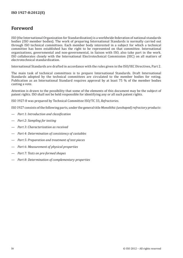 Keywords: ISO 1927-8:2012, monolithic refractory products, unshaped refractory products, complementary properties, permeability to gases, thermal shock resistance, thermal conductivity, sulfuric acid resistance, carbon-containing refractory tests, CO resistance, abrasion resistance, test methods.
