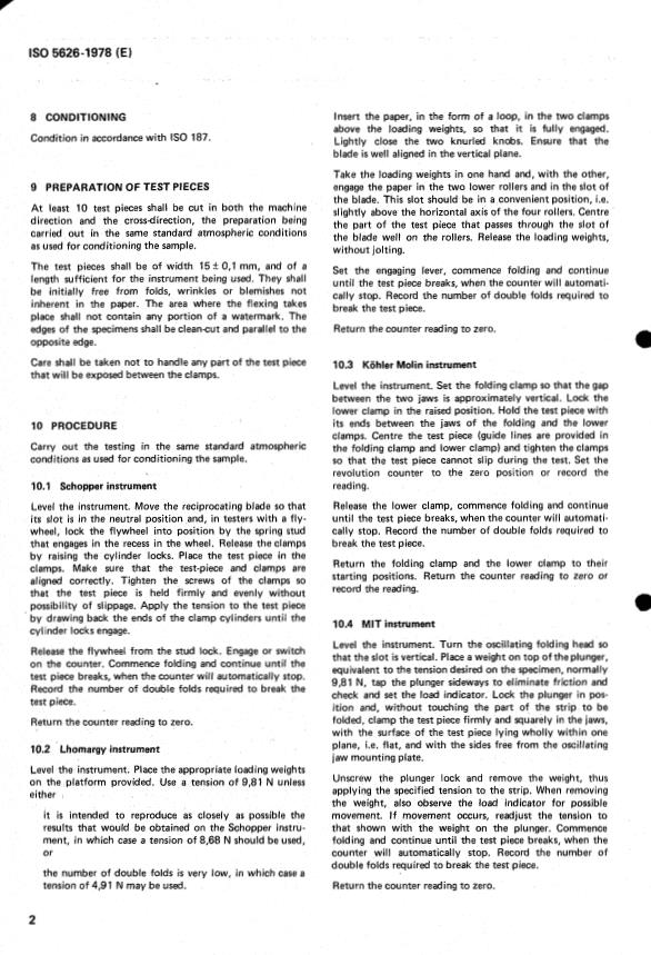 ISO 5626:1978 is a standard published by the International Organization for Standardization (ISO). Its full title is "Paper — Determination of folding endurance". This standard covers: Paper — Determination of folding endurance
