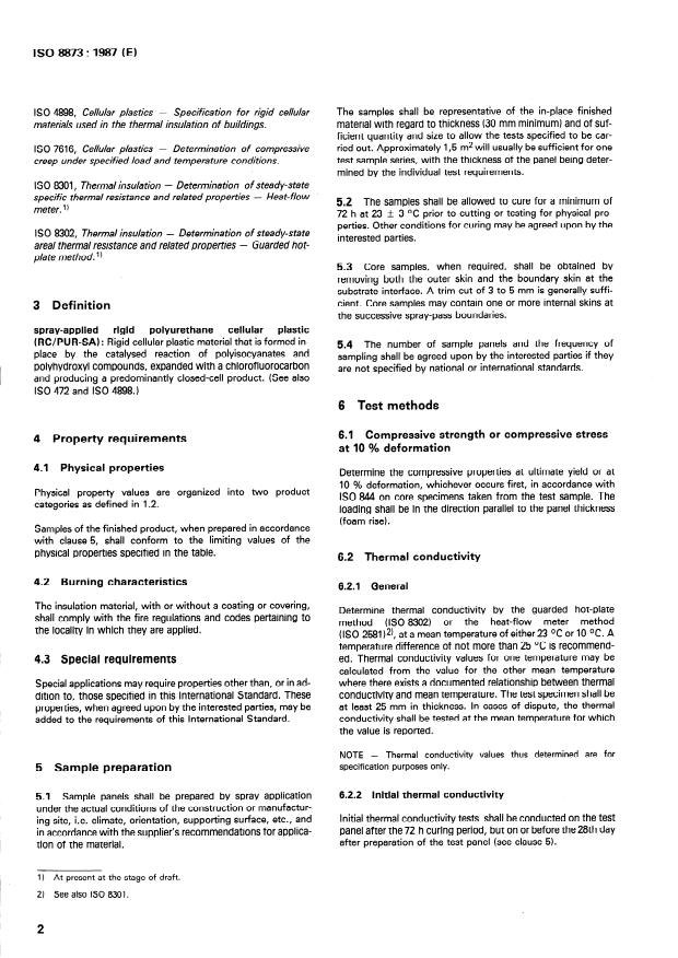 ISO 8873:1987 is a standard published by the International Organization for Standardization (ISO). Its full title is "Cellular plastics, rigid — Spray-applied polyurethane foam for thermal insulation of buildings — Specification". This standard covers: Specifies the rquirements and test methods for spray- applied rigid polyurethane cellular plastics used as thermal insulation in two loadbearing categories. The foam may be either produce on site or in a manufactoring facility. The test samples shall be representative of the in place finshed material and of sufficient quantity and size to allow the tests specified to be carried out. The property requirements of RC/PUR- SA for thermal insulation of buildings are listed in a table.