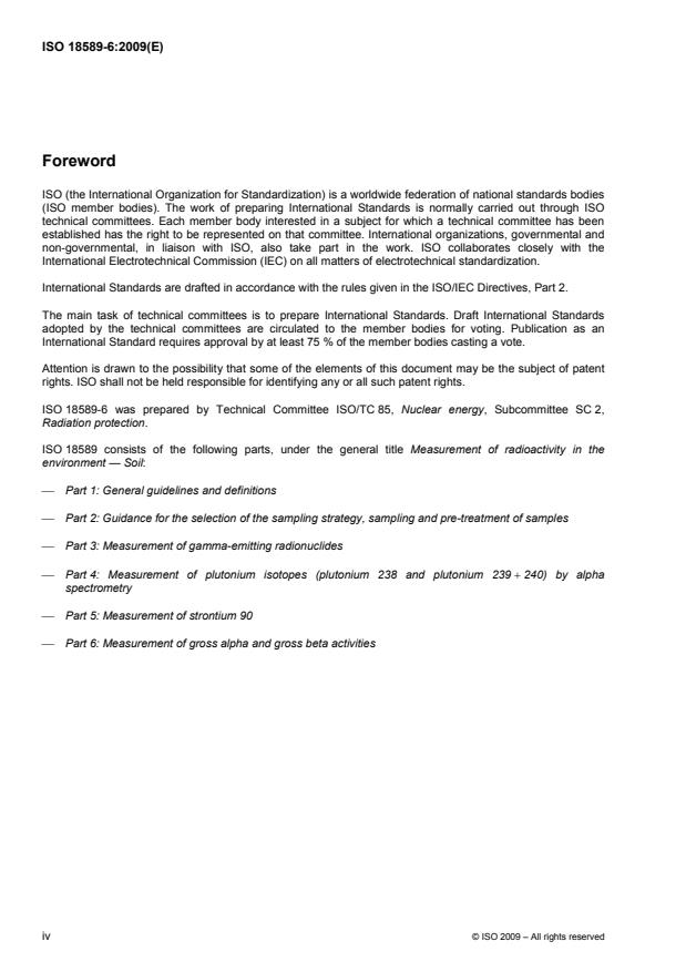 ISO 18589-6:2009 is a standard published by the International Organization for Standardization (ISO). Its full title is "Measurement of radioactivity in the environment — Soil — Part 6: Measurement of gross alpha and gross beta activities". This standard covers: ISO 18589-6:2009 provides a method that allows an estimation of gross radioactivity of alpha- and beta-emitters present in soil samples. ISO 18589-6:2009 applies, essentially, to systematic inspections based on comparative measurements or to preliminary site studies to guide the testing staff both in the choice of soil samples for measurement as a priority and in the specific analysis methods for implementation. The gross a or β radioactivity is generally different from the sum of the effective radioactivities of the radionuclides present since, by convention, the same alpha counting efficiency is assigned for all the alpha emissions and the same beta counting efficiency is assigned for all the beta emissions