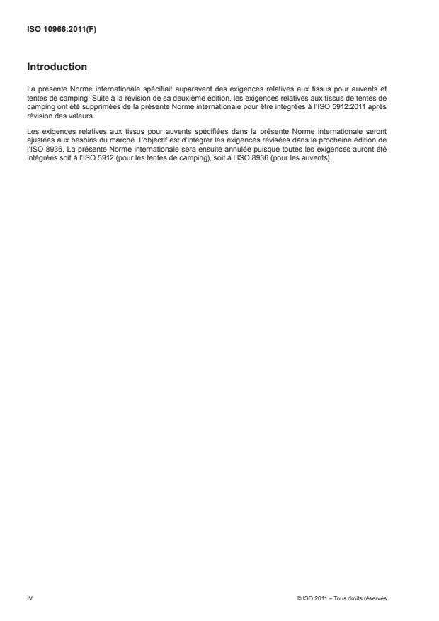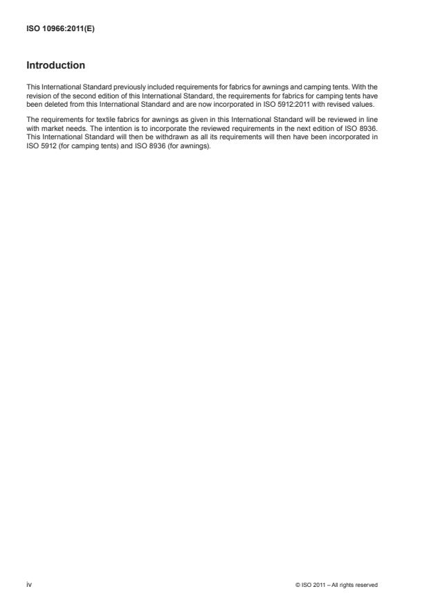 This International Standard previously included requirements for fabrics for awnings and camping tents. With the