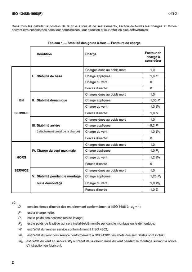 Tableau 1 — Stabilité des grues à tour — Facteurs de charge
