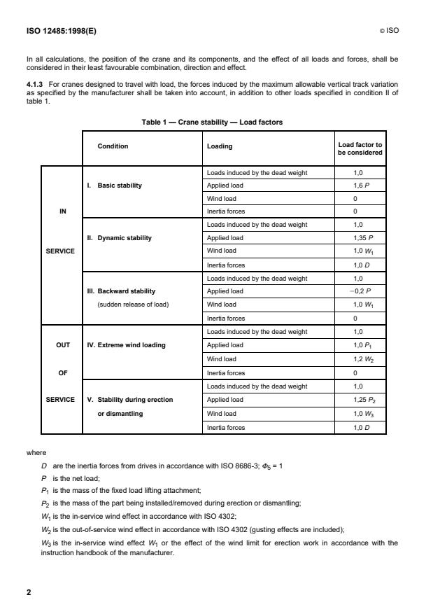 Table 1 — Crane stability — Load factors