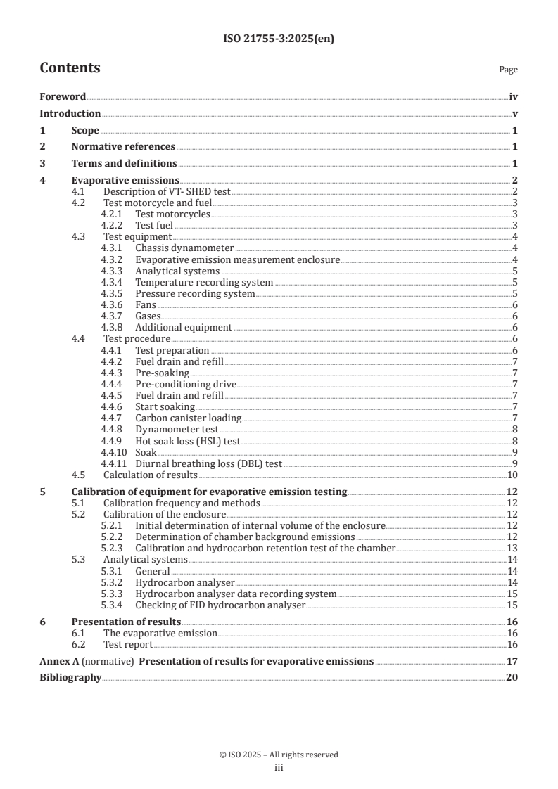 ISO 21755-3:2025 is a standard published by the International Organization for Standardization (ISO). Its full title is "Motorcycles - Measurement method for evaporative emissions - Part 3: VT-SHED test procedure". This standard covers: This document specifies a basic measurement method by using the variable temperature sealed housing for evaporative determination (VT-SHED) test procedure for evaporative emissions from motorcycles. It is applicable to motorcycles equipped with a spark ignition engine (four-stroke engine, two-stroke engine or rotary piston engine).
