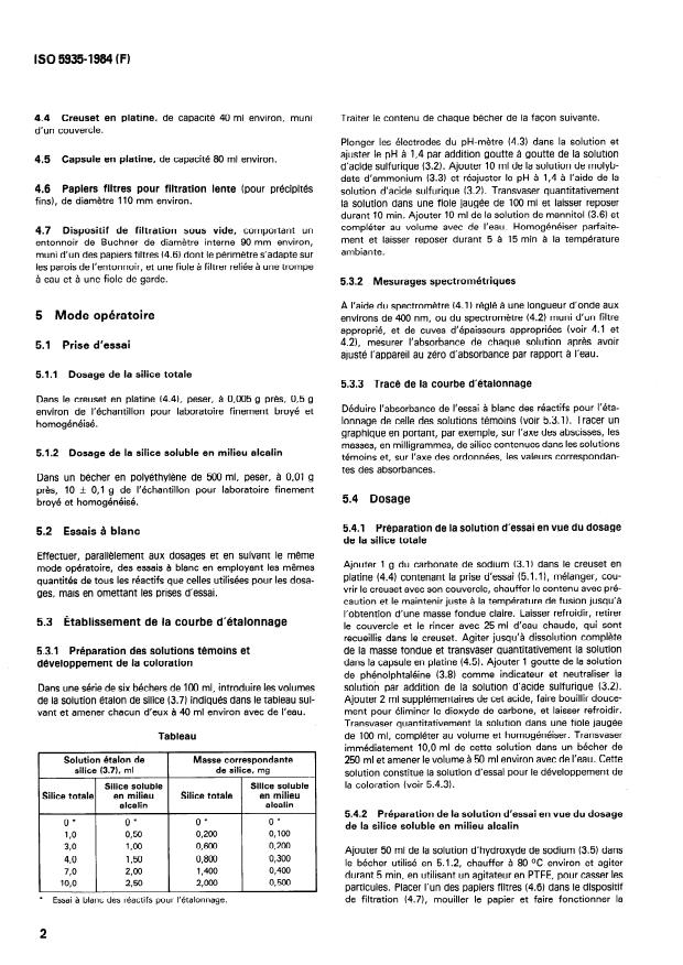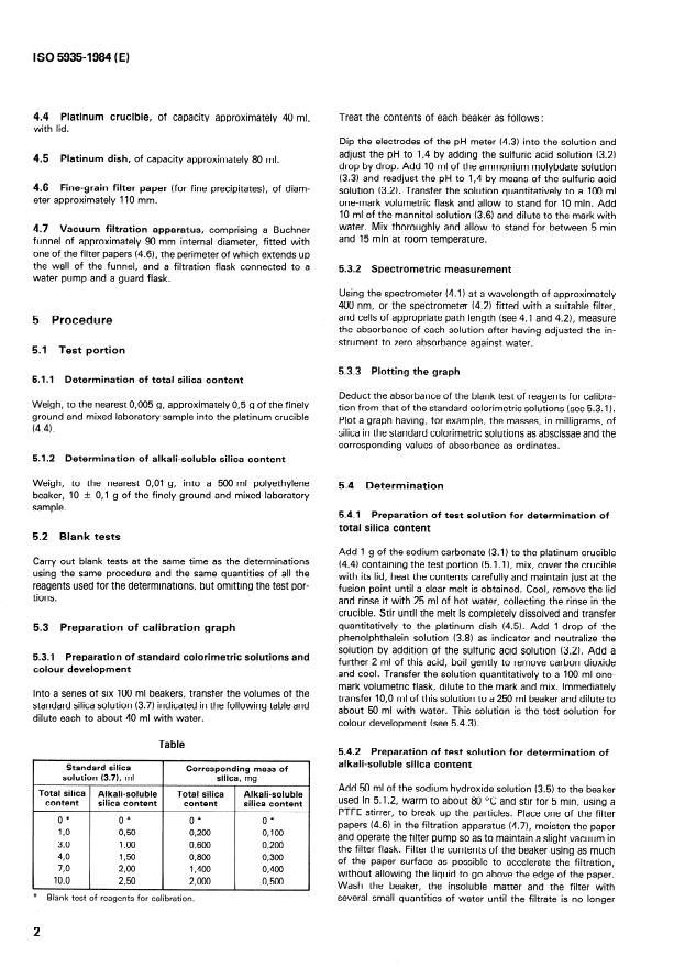 ISO 5935:1984 is a standard published by the International Organization for Standardization (ISO). Its full title is "Crude sodium borates for industrial use — Determination of total and alkali-soluble silica contents — Molybdosilicate spectrometric method". This standard covers: Specifies a method using test solutions to be prepared by fusion of a test portion with sodium carbonate for the determination of the total silica content, and by dissolution of the alkalisoluble part of a test portion in sodium hydroxide solution for the determination of the alkali-soluble silica content. This results in the formation of molybdosilicate, followed by spectrometric measurement at a wavelength of about 400 nm. Applies to products having total silica contents in the range 0,4 to 4,0 % (m/m) and alkali-soluble silica contents in the range 0,01 to 0,05 % (m/m).