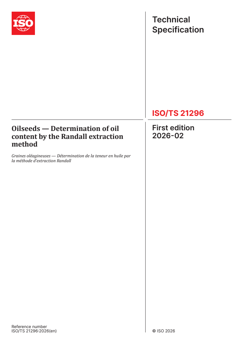ISO/TS 21296:2026 - Oilseeds — Determination of oil content by the Randall extraction method Released:2/12/2026