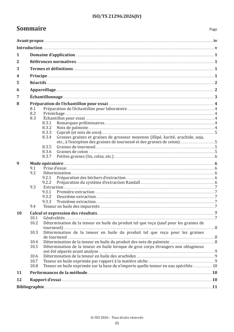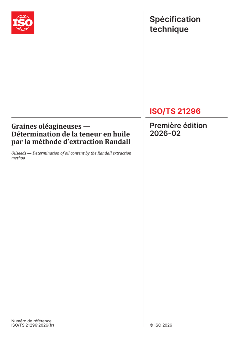 ISO/TS 21296:2026 - Graines oléagineuses — Détermination de la teneur en huile par la méthode d’extraction Randall Released:2/12/2026