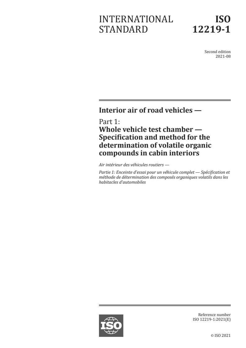 ISO 12219-1:2021 - Interior air of road vehicles — Part 1: Whole vehicle test chamber — Specification and method for the determination of volatile organic compounds in cabin interiors Released:8/31/2021
