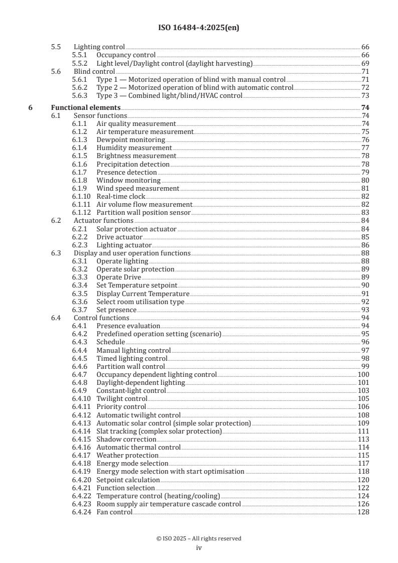 ISO 16484-4:2025 is a standard published by the International Organization for Standardization (ISO). Its full title is "Building automation and control systems (BACS) - Part 4: Control applications". This standard covers: This document specifies control applications and function blocks focusing on, but not limited to, lighting, solar protection and heating, ventilation and air conditioning (HVAC) applications. It describes how energy performance, comfort, and operational requirements of buildings are translated into functional specifications for integrated plant and room control.