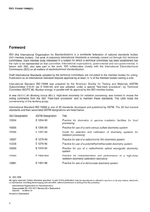 ISO 15569:1998 is a standard published by the International Organization for Standardization (ISO). Its full title is "Practice for dosimetry in an electron-beam facility for radiation processing at energies between 300 keV and 25 MeV". This standard covers: Practice for dosimetry in an electron-beam facility for radiation processing at energies between 300 keV and 25 MeV