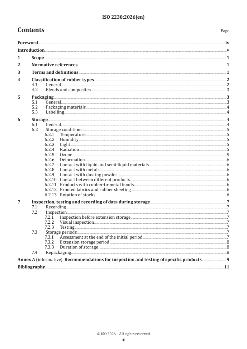 ISO 2230:2026 is a standard published by the International Organization for Standardization (ISO). Its full title is "Rubber products — Guidelines for storage". This standard covers: This document gives guidelines for inspection, recording procedures, packaging and storage of products, assemblies and components made from vulcanized or thermoplastic rubber prior to being put into circulation. It is applicable to both solid and cellular rubber products prepared from dry raw rubber, latex or other sources. It is not intended for use with raw rubber in bale, liquid (solution or emulsion) or particulate form, storage guidance for which is given in ISO 7664. NOTE The recommendations for packaging form an integral part of the controlled storage procedure, as well as providing means of identifying the material and product.