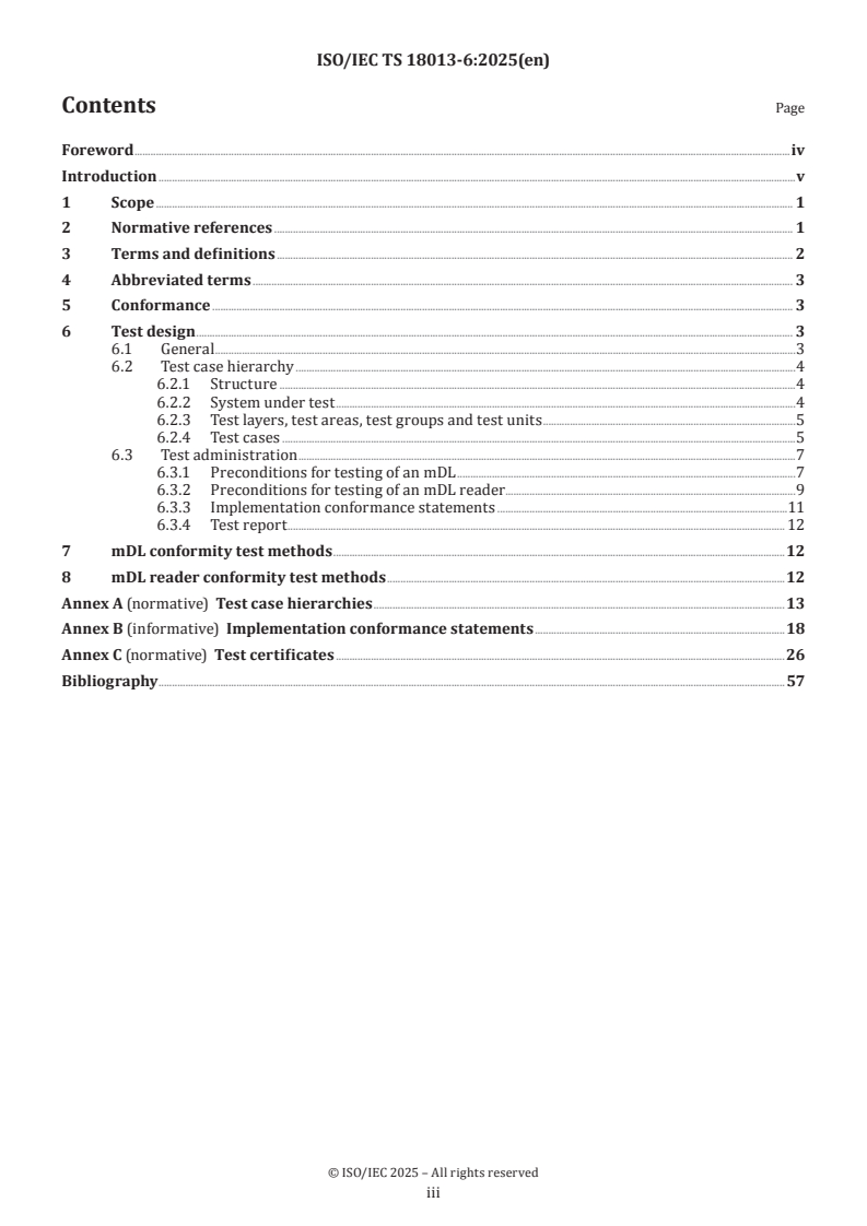 ISO/IEC TS 18013-6:2025 is a technical specification published by the International Organization for Standardization (ISO). Its full title is "Personal identification - ISO-compliant driving licence - Part 6: mDL test methods". This standard covers: This document specifies test methods for testing conformity of a mobile driving licence (mDL) or an mDL reader to ISO/IEC 18013-5. This document specifies test methods for: - mDL on its interface to an mDL reader; - mDL reader on its interface to an mDL; - mDL reader on its (optional) interface to an issuing authority infrastructure. Test cases for an issuing authority infrastructure on its interface to an mDL reader are not included in this document. Test cases for the use of OpenID Connect (OIDC) by an mDL reader on its interface to an issuing authority infrastructure are not included in this document. This document only provides test cases for the use of WebAPI on this interface. This document only addresses the functional behaviour of an implementation under test (IUT) on its interface(s) in scope. It does not address: - the internal implementation of an IUT, such as a secure area in an mDL; - any functional requirements to an IUT not specified in ISO/IEC 18013-5, for example, requirements of a particular issuing authority; - non-functional aspects of the IUT, nor IUT interfaces not listed above, such as the interface from an issuing authority infrastructure to an mDL, used to provision mDL data.