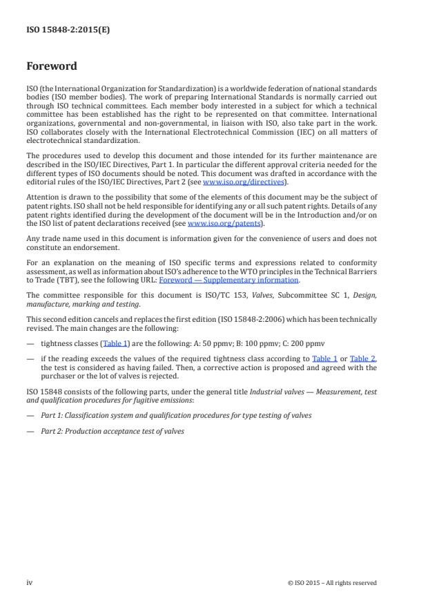 ISO 15848-2:2015 defines the production acceptance test for industrial valves to control fugitive emissions. It specifies factory-level test procedures to evaluate external leakage from valve stems/shafts and body joints of isolating and control valves intended for use with volatile air pollutants and hazardous fluids. End-connection joints, vacuum service, corrosion and radiation effects are explicitly excluded. The standard is intended for standard production valves whose fugitive emissions requirements are specified by the purchaser.