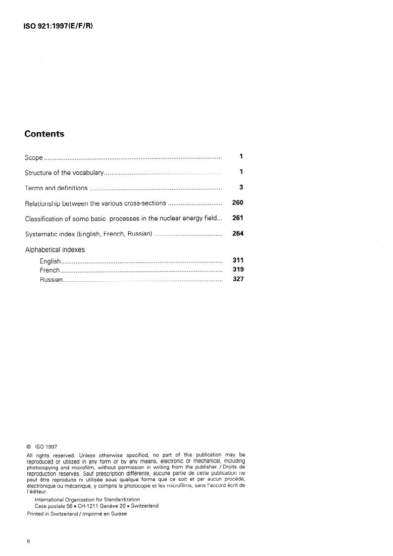 ISO 921:1997 is a standard published by the International Organization for Standardization (ISO). Its full title is "Nuclear energy — Vocabulary". This standard covers: Gives terms and definitions in English, French and Russian used in the field of nuclear energy. The entry is in accordance with ISO 10241:1992