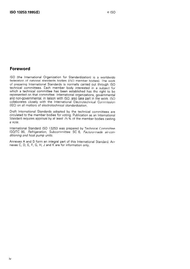 ISO 13253:1995 is a standard published by the International Organization for Standardization (ISO). Its full title is "Ducted air-conditioners and air-to-air heat pumps — Testing and rating for performance". This standard covers: Establishes performance testing and rating criteria for ducted air-conditioners using air- and water-cooled condensers and ducted air-to-air heat pumps. Is limited to systems which use a single refrigeration circuit and have one evaporator and one condenser.
