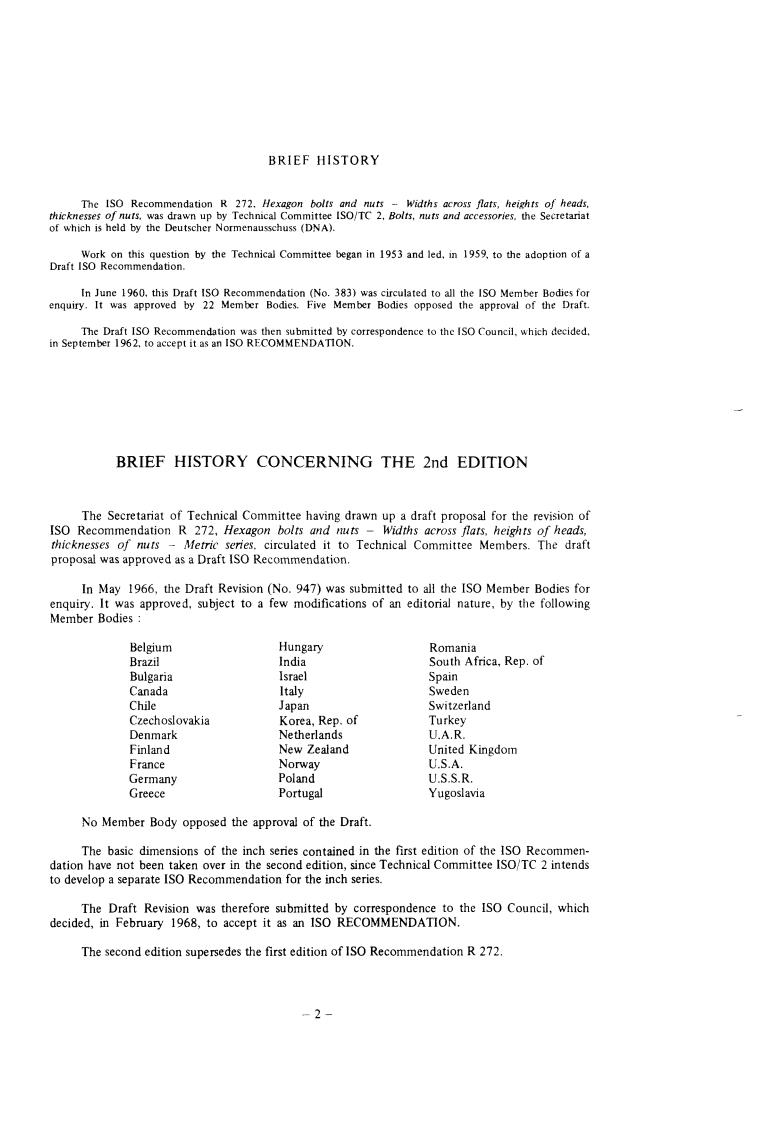 IS0 Recommendation R 272, Hexagon bolts and nuts - Widths across flats, heights of heads,