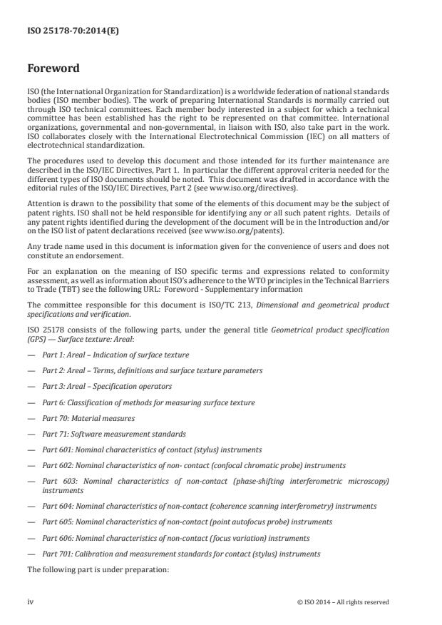 - ISO 10012 and ISO/IEC 17025 (measurement and laboratory management) For implementation or procurement of material measures, consult the full ISO 25178-70:2014 text and associated annexes for measurement requirements, types, and certification details.