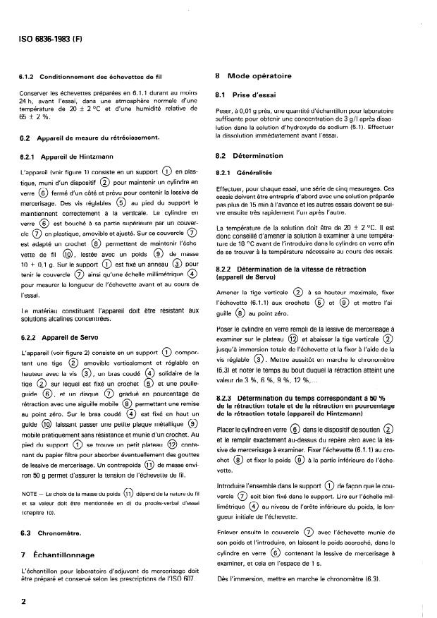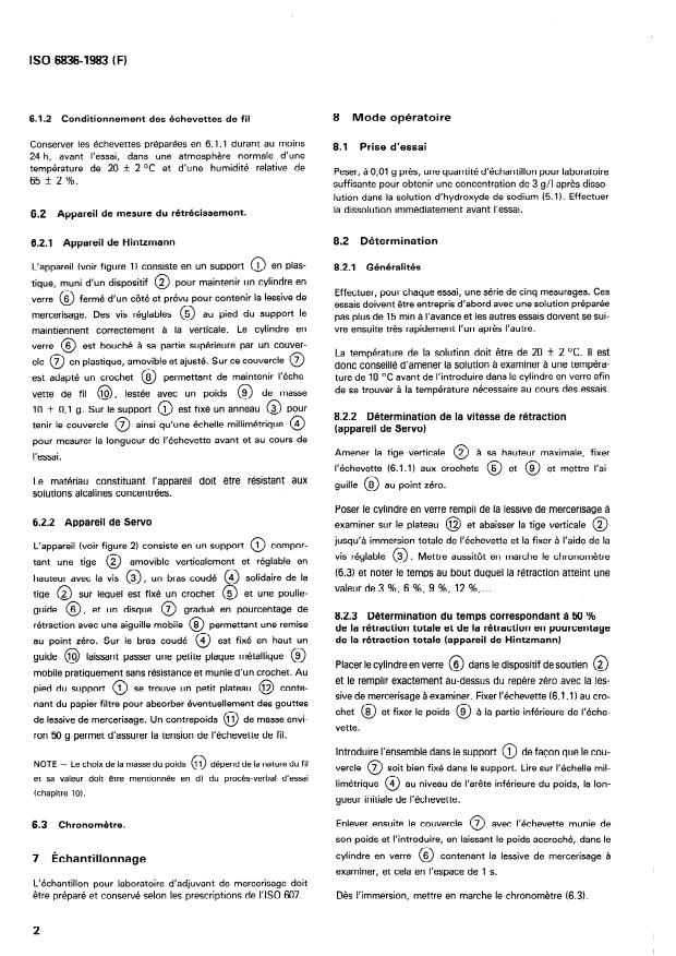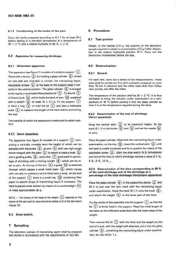 Keywords: ISO 6836:1983, mercerizing agents, surface active agents, wetting products, shrinkage rate, cotton, mercerization testing, Hintzmann apparatus, servo apparatus, sodium hydroxide solution.