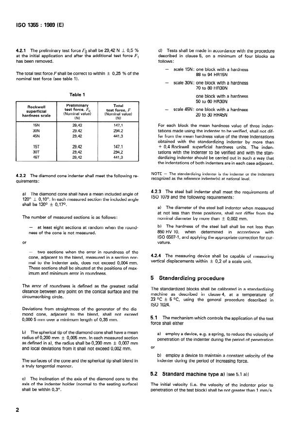 ISO 1355:1989 is a standard published by the International Organization for Standardization (ISO). Its full title is "Metallic materials — Hardness test — Calibration of standardized blocks to be used for Rockwell superficial hardness testing machines (scales 15N, 30N, 45N, 15T, 30T and 45T)". This standard covers: Metallic materials — Hardness test — Calibration of standardized blocks to be used for Rockwell superficial hardness testing machines (scales 15N, 30N, 45N, 15T, 30T and 45T)