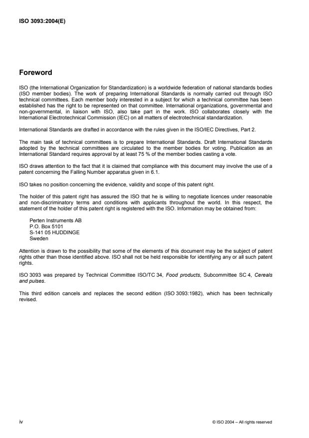 ISO 3093:2004 - Wheat, rye and respective flours, durum wheat and durum wheat semolina -- Determination of the Falling Number according to Hagberg-Perten
