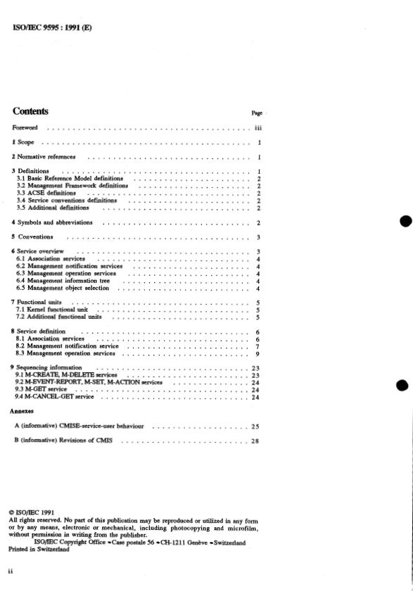 ISO/IEC 9595:1991 is a standard published by the International Organization for Standardization (ISO). Its full title is "Information technology — Open systems Interconnection — Common management information service definition". This standard covers: Information technology — Open systems Interconnection — Common management information service definition