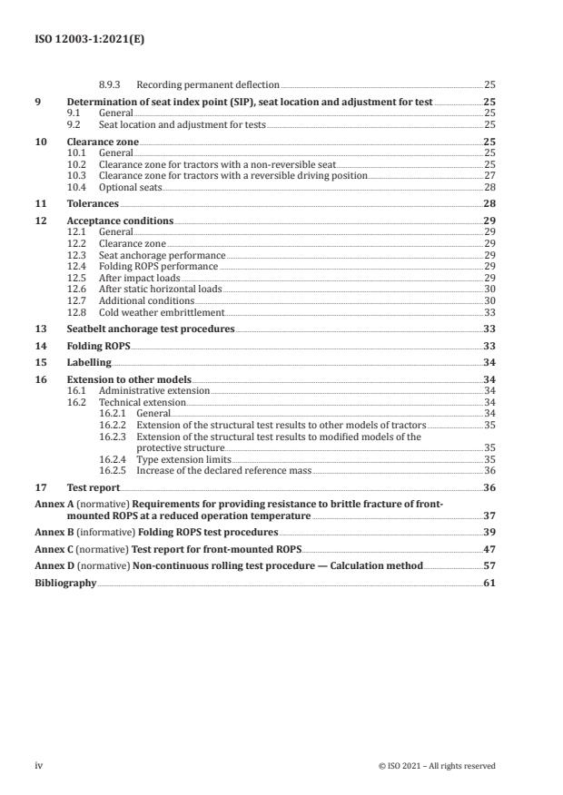 ISO 12003-1:2021 is a standard published by the International Organization for Standardization (ISO). Its full title is "Tractors for agriculture and forestry — Roll-over protective structures on narrow tractors — Part 1: Front-mounted ROPS". This standard covers: This document specifies procedures for both the static and dynamic strength testing of roll-over protective structures (ROPS) front-mounted on narrow tractors. It defines the clearance zone and acceptance conditions for rigid or tiltable, front, two-post ROPS, including any associated rear fixtures, and is applicable to tractors so equipped having the following characteristics: — a ground clearance of not more than 600 mm beneath the lowest points of the front- and rear-axle housings (not considering lower points on the axle differential); — a fixed or adjustable minimum track width of one of the two axles of less than 1 150 mm; NOTE It is understood that the axle mounted with the wider tyres is set at a track width of not more than 1 150 mm. Tyre track width is adjustable so that the outer edges of the narrower tyres do not extend beyond the outer edges of the tyres of the other axle. Where the two axles are fitted with rims and tyres of the same size, the fixed or adjustable track width of the two axles is less than 1 150 mm. — a mass greater than 400 kg but less than 3 500 kg, unballasted, including the ROPS and tyres of the largest size recommended by the manufacturer; — fitted with roll-over protective structures of the dual-pillar type mounted only in front of the seat index point (SIP) and characterised by a reduced clearance zone attributable to the tractor silhouette. This document also specifies optional testing procedures for both seat anchorage points and folding efforts of front-mounted ROPS designed to fold.