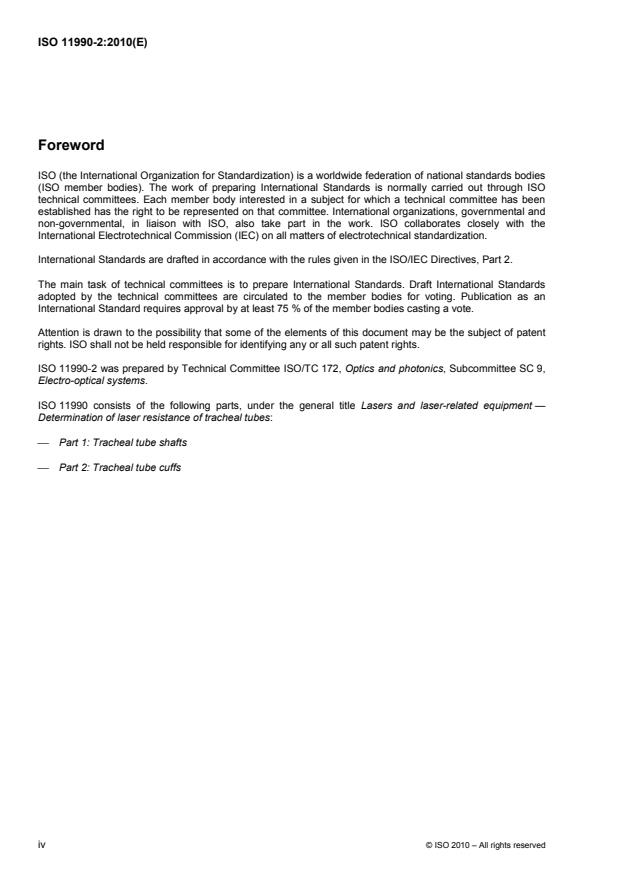 ISO 11990-2:2010 is a standard published by the International Organization for Standardization (ISO). Its full title is "Lasers and laser-related equipment — Determination of laser resistance of tracheal tubes — Part 2: Tracheal tube cuffs". This standard covers: ISO 11990‑2:2010 specifies a method of testing the continuous wave (cw) resistance of the cuff regions of tracheal tubes designed to resist ignition by a laser. Other components of the system, such as the inflation system and shaft are outside the scope of ISO 11990‑2:2010.