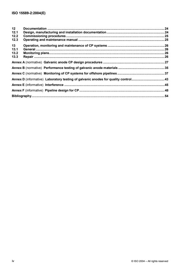 ISO 15589-2:2004 is a standard published by the International Organization for Standardization (ISO). Its full title is "Petroleum and natural gas industries — Cathodic protection of pipeline transportation systems — Part 2: Offshore pipelines". This standard covers: ISO 15589-2:2004 specifies requirements and gives recommendations for the pre-installation surveys, design, materials, equipment, fabrication, installation, commissioning, operation, inspection and maintenance of cathodic protection systems for offshore pipelines for the petroleum and natural gas industries as defined in ISO 13623. ISO 15589-2:2004 is applicable to carbon and stainless steel pipelines in offshore service. ISO 15589-2:2004 is applicable to retrofits, modifications and repairs made to existing pipeline systems. ISO 15589-2:2004 is applicable to all types of seawater and seabed environments encountered in submerged conditions and on risers up to mean water level. Note that special conditions sometimes exist where cathodic protection is ineffective or only partially effective. Such conditions can include elevated temperatures, disbonded coatings, thermal insulating coatings, shielding, bacterial attack, and unusual contaminants in the electrolyte.