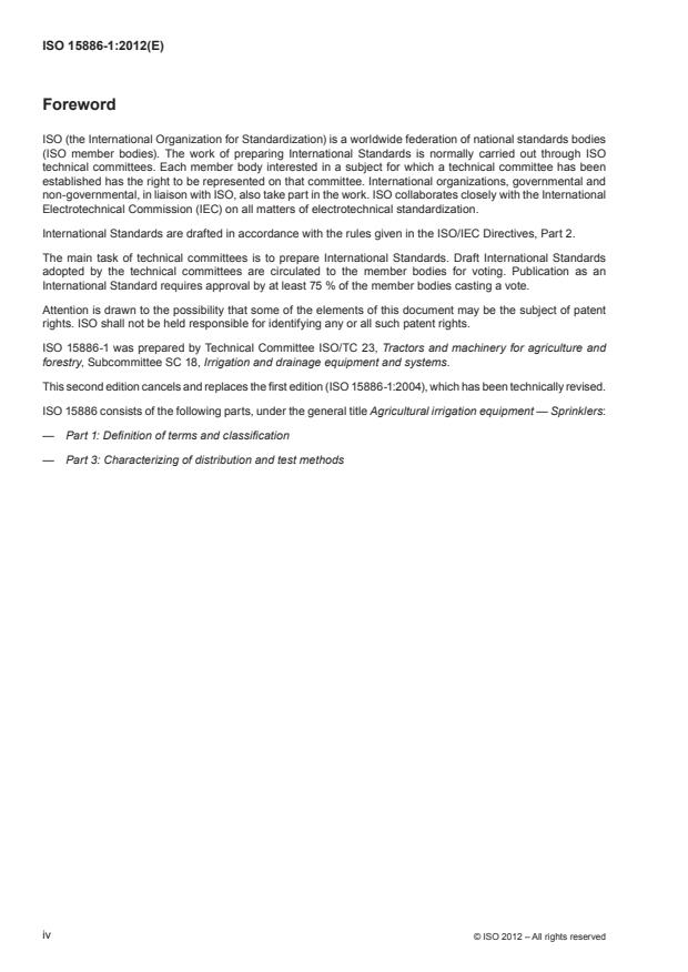 ISO 15886-1:2012 defines terms related to irrigation sprinklers and specifies the classification of sprinklers according to the following categories: physical factors; characteristics of the water spray; the mechanism for operation and water distribution; the mechanism for sealing; the intended use; additional functions incorporated into the sprinkler. The scope is intentionally broad to cover the widest possible range of sprinkler construction, performance, and intended-use alternatives.