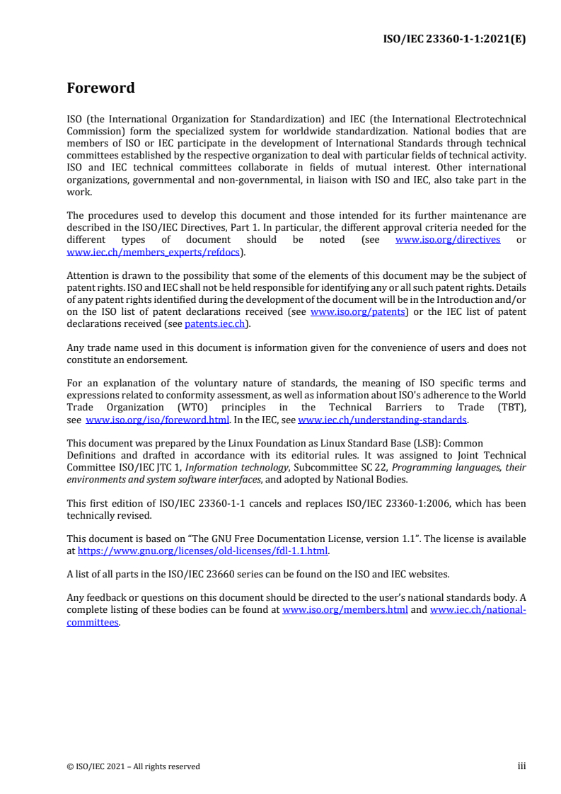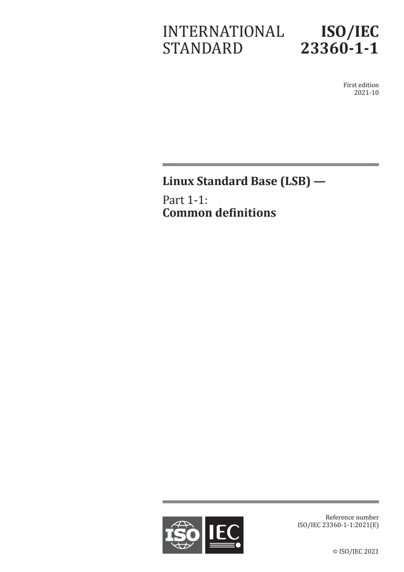 ISO/IEC 23360-1-1:2021 specifies the Linux Standard Base (LSB) - Part 1-1: Common definitions. It defines a portable system interface for compiled applications and a minimal runtime environment for installation scripts to enable a uniform industry standard for high‑volume Linux applications. The standard is primarily a binary interface (ABI) definition augmented by API-level information where relevant, and it splits each module into a common part and an architecture‑specific part to cover processor differences.