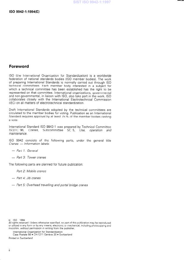 ISO 9942-1:1994 is a standard published by the International Organization for Standardization (ISO). Its full title is "Cranes — Information labels — Part 1: General". This standard covers: Specifies the minimum requirements for labels for the identification and the operation of cranes.