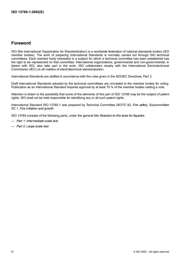 ISO 13785-1:2002 is a standard published by the International Organization for Standardization (ISO). Its full title is "Reaction-to-fire tests for façades — Part 1: Intermediate-scale test". This standard covers: ISO 13785-1:2002 specifies a screening method for determining the reaction to fire of materials and constructions of façades or claddings when exposed to heat from a simulated external fire with flames impinging directly upon a façade. It is intended for use by producers to reduce the burden of testing in ISO 13785-2:2002 by eliminating those systems that fail the tests described in ISO 13785-1:2002. The test method consists of observing the behaviour of the façade panel construction to fire and the resulting flame spread on or within the façade construction. This test method is applicable only to façades and claddings that are not free standing and that are used by adding to an existing external wall. This test method also is applicable only to vertical elements and is not applicable to determining the structural strength of the façade or cladding.