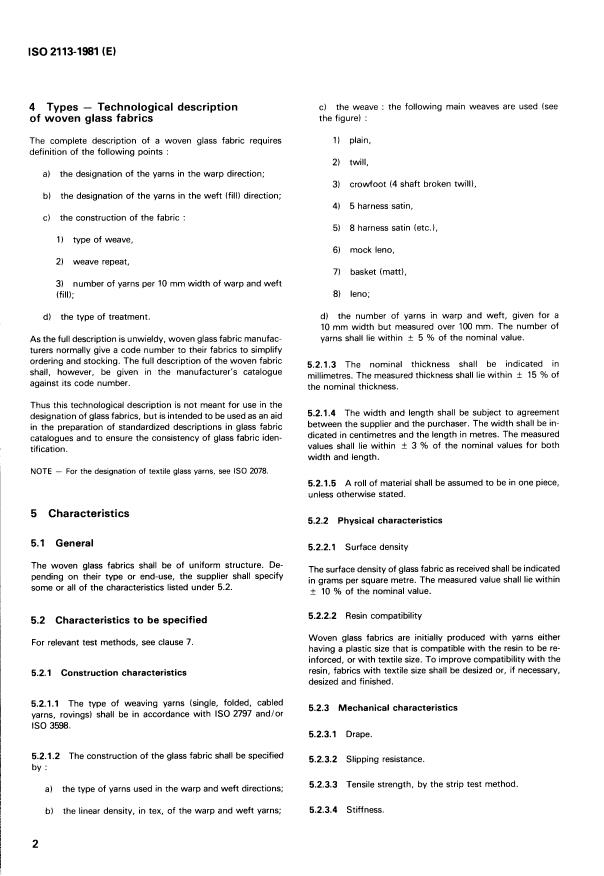 ISO 2113:1981 is a standard published by the International Organization for Standardization (ISO). Its full title is "Textile glass — Woven fabrics — Basis for specification". This standard covers: Textile glass — Woven fabrics — Basis for specification