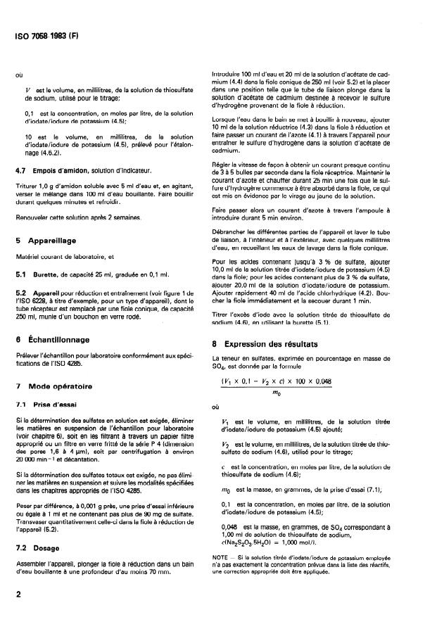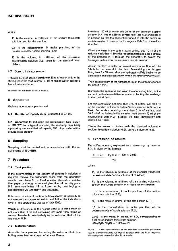ISO 7058:1983 is a standard published by the International Organization for Standardization (ISO). Its full title is "Phosphoric acid for industrial use — Determination of higher soluble sulfate contents — Titrimetric method after reduction". This standard covers: The sulphate present in a test portion is reduced to sulphide by a mixture of hydriodic and phosphinic (hypophosphorous) acids. The hydrogen sulphide evolved is absorbed in an excess of cadmium acetate solution. The cadmium sulphide formed is oxidized by an excess of standard volumetric potassium iodate/iodide solsution, and the excess iodine is titrated with standard volumetric sodium thiosulphate solution, using starch as indicator. The method is applicable to products having sulphate contents between 0.2 and 6 % (m/m).