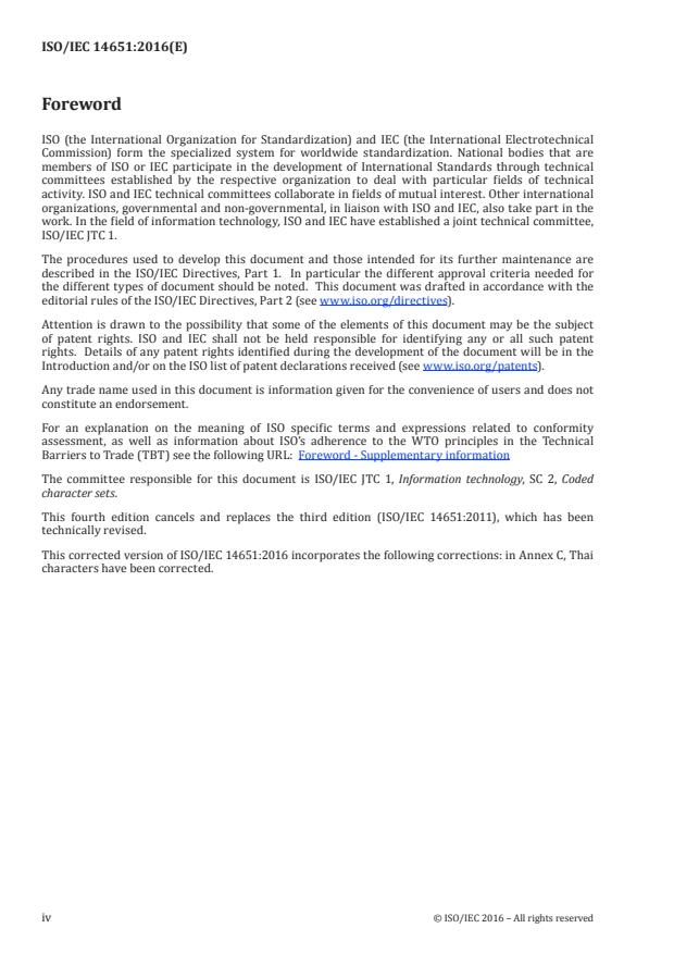 ISO/IEC 14651:2016 is a standard published by the International Organization for Standardization (ISO). Its full title is "Information technology — International string ordering and comparison — Method for comparing character strings and description of the common template tailorable ordering". This standard covers: ISO/IEC 14651:2016 defines the following. - A reference comparison method. This method is applicable to two character strings to determine their collating order in a sorted list. The method can be applied to strings containing characters from the full repertoire of ISO/IEC 10646. This method is also applicable to subsets of that repertoire, such as those of the different ISO/IEC 8-bit standard character sets, or any other character set, standardized or not, to produce ordering results valid (after tailoring) for a given set of languages for each script. This method uses collation tables derived either from the Common Template Table defined in this International Standard or from one of its tailorings. This method provides a reference format. The format is described using the Backus-Naur Form (BNF). This format is used to describe the Common Template Table. The format is used normatively within this International Standard. - A Common Template Table. A given tailoring of the Common Template Table is used by the reference comparison method. The Common Template Table describes an order for all characters encoded in the Unicode 8.0 standard, included in ISO/IEC 10646:2014 and its Amendment 1. It allows for a specification of a fully deterministic ordering. This table enables the specification of a string ordering adapted to local ordering rules, without requiring an implementer to have knowledge of all the different scripts already encoded in the Universal Coded Character Set (UCS). NOTE 1 This Common Template Table is to be modified to suit the needs of a local environment. The main worldwide benefit is that, for other scripts, often no modification is required and the order will remain as consistent as possible and predictable from an international point of view. NOTE 2 The character repertoire used in this International Standard is equivalent to that of the Unicode Standard version 6.0. - A reference name. The reference name refers to this particular version of the Common Template Table, for use as a reference when tailoring. In particular, this name implies that the table is linked to a particular stage of development of the ISO/IEC 10646 Universal coded character set. - Requirements for a declaration of the differences (delta) between the collation table and the Common Template Table. This International Standard does not mandate the following. - A specific comparison method; any equivalent method giving the same results is acceptable. - A specific format for describing or tailoring tables in a given implementation. - Specific symbols to be used by implementations, except for the name of the Common Template Table. - Any specific user interface for choosing options. - Any specific internal format for intermediate keys used when comparing, nor for the table used. The use of numeric keys is not mandated either. - A context-dependent ordering. - Any particular preparation of character strings prior to comparison. NOTE It is normally necessary to do preparation of character strings prior to comparison even if it is not prescribed by this International Standard (see Annex C). Although no user interface is required to choose options or to specify tailoring of the Common Template Table, conformance requires always declaring the applicable delta, a declaration of differences with this table. It is recommended that processes present available tailoring options to users.