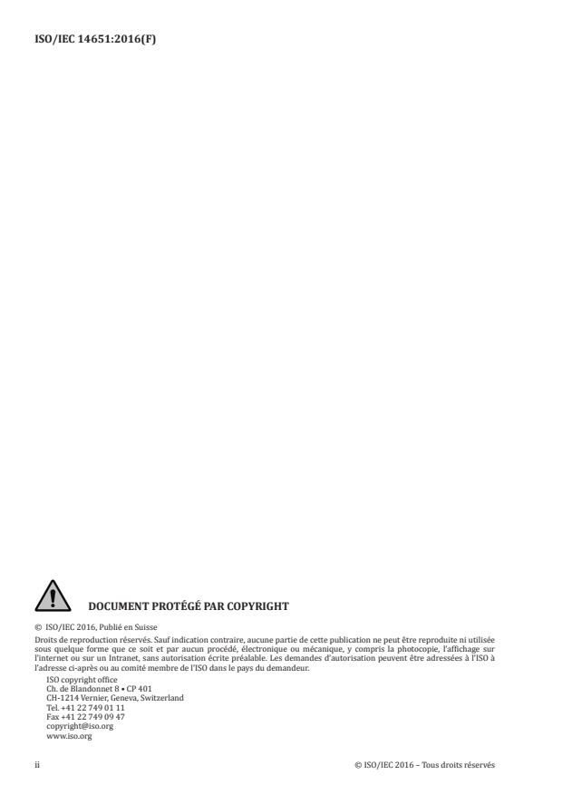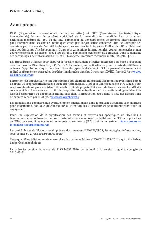 L'ISO/IEC 14651:2016 définit ce qui suit. Une méthode de référence pour la comparaison de deux chaînes de caractères ayant pour but de déterminer leur ordre de classement dans une liste triée. La méthode s'applique à des chaînes utilisant le répertoire complet de l'ISO/CEI 10646, des sous-répertoires tels que ceux des divers jeux normalisés ISO/CEI à 8 bits ou tout autre jeu de caractères, et permet de produire des résultats de tri valables (après adaptation) pour un ensemble de langues de chaque système d'écriture. Cette méthode de référence utilise des tables de tri dérivées soit de la table-modèle commune de classement définie dans la présente Norme internationale, soit d'une de ses adaptations. La méthode procure un format de référence de la table-modèle commune. Ce format est décrit en notation BNF (forme de Backus-Naur). Son emploi est normatif dans l'ISO/IEC 14651:2016. Une table-modèle commune de classement utilisée par la méthode de référence. Cette table décrit un ordre de base pour tous les caractères du standard Unicode 8.0 compris dans l'ISO/CEI 10646:2014 et son amendement 1. Tout cela permet de spécifier un ordre complètement déterministe. Cette table constitue le point de départ permettant de préciser un ordre de classement adapté aux règles de classement locales, sans qu'il soit nécessaire de connaître tous les systèmes d'écriture repris dans le jeu universel de caractères codés (JUC). Un nom de référence représentant cette version particulière de la table-modèle commune, à utiliser comme point de départ à toute adaptation. Ce nom implique notamment que la table est liée à un stade de développement particulier du jeu universel de caractères codés (ISO/CEI 10646). Des exigences pour la déclaration de différences (delta) entre une table de tri et la table-modèle commune. L'ISO/IEC 14651:2016 ne prescrit pas ce qui suit. Une méthode particulière de comparaison; toute méthode équivalente conduisant aux mêmes résultats est acceptable. Un format précis pour décrire ou pour adapter les tables dans une mise en ?uvre donnée. Des symboles précis à utiliser par les mise en ?uvre, sauf pour ce qui est du nom de la table-modèle commune de classement. Une interface utilisateur particulière destinée à choisir les options. Un format interne particulier pour les clés intermédiaires utilisées dans les comparaisons ou pour la table de tri. L'utilisation de clés numériques n'est pas prescrite non plus. Un ordre dépendant du contexte. Un prétraitement particulier des chaînes de caractères avant comparaison.