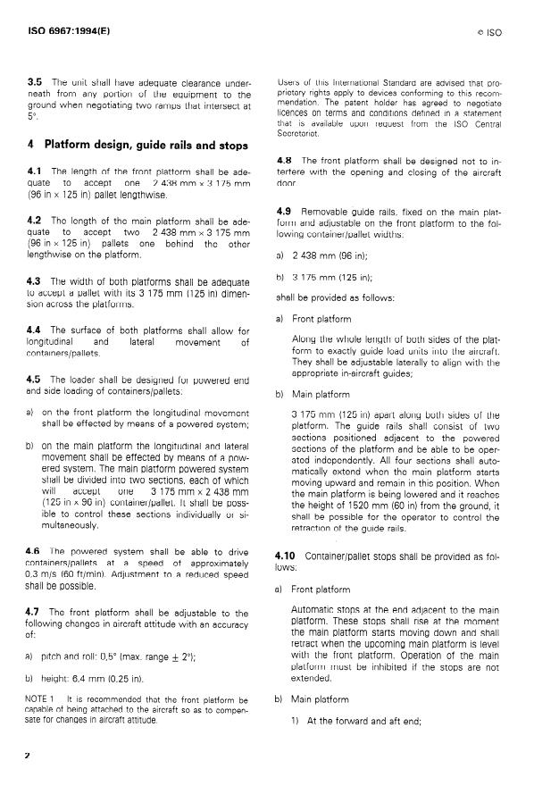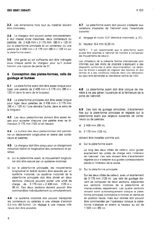 ISO 6967:1994 is a standard published by the International Organization for Standardization (ISO). Its full title is "Aircraft — Wide body aircraft main deck container/pallet loader — Functional requirements". This standard covers: Specifies the requirements for a self-propelled loader capable of raising pallets and containers with base dimensions and maximum weights according to the table. Gives information on structure and overall dimensions, platform design, guide rails and stops, platform operation and loading, mobility and stability and controls.