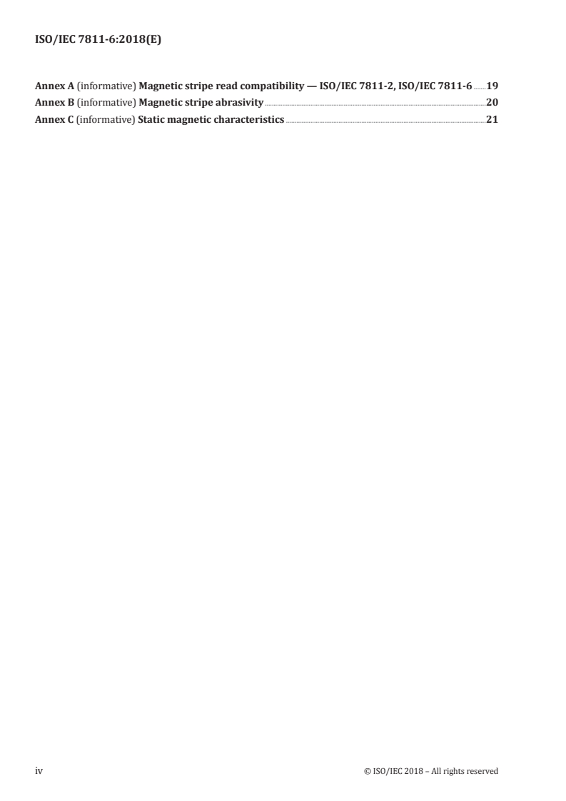 ISO/IEC 7811-6:2018 is a standard published by the International Organization for Standardization (ISO). Its full title is "Identification cards - Recording technique - Part 6: Magnetic stripe: High coercivity". This standard covers: ISO/IEC 7811 defines the characteristics for identification cards as defined in Clause 3 of this document and the use of such cards for international interchange. This document specifies requirements for a high coercivity magnetic stripe (including any protective overlay) on an identification card, the encoding technique and coded character sets. It takes into consideration both human and machine aspects and states minimum requirements. Coercivity influences many of the quantities specified in this document but is not itself specified. The main characteristic of the high coercivity magnetic stripe is its improved resistance to erasure. This is achieved with minimal probability of damage to other magnetic stripes by contact while retaining read compatibility with magnetic stripes as defined in ISO/IEC 7811-2. ISO/IEC 7811 provides criteria to which cards are to perform. No consideration is given within ISO/IEC 7811 to the amount of use, if any, experienced by the card prior to test. Failure to conform to specified criteria is negotiated between the involved parties. ISO/IEC 10373-2 specifies the test procedures used to check cards against the parameters specified in this document. NOTE Numeric values in the SI and/or Imperial measurement system in this document may have been rounded off and are consistent with, but not exactly equal to each other. Using either system is correct but intermixing or reconverting values can result in errors. The original design was made using the Imperial measurement system.