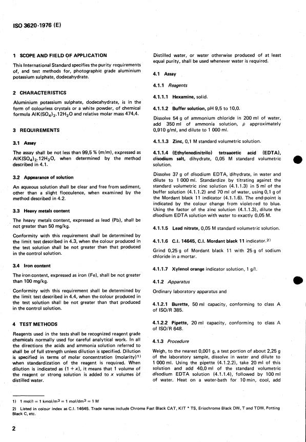 ISO 3620:1976 - Photographic grade aluminium potassium sulphate dodecahydrate -- Specification