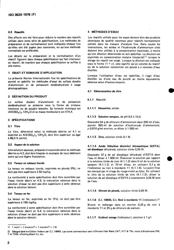 ISO 3620:1976 - Sulfate double d'aluminium et de potassium dodécahydraté de qualité photographique -- Spécifications