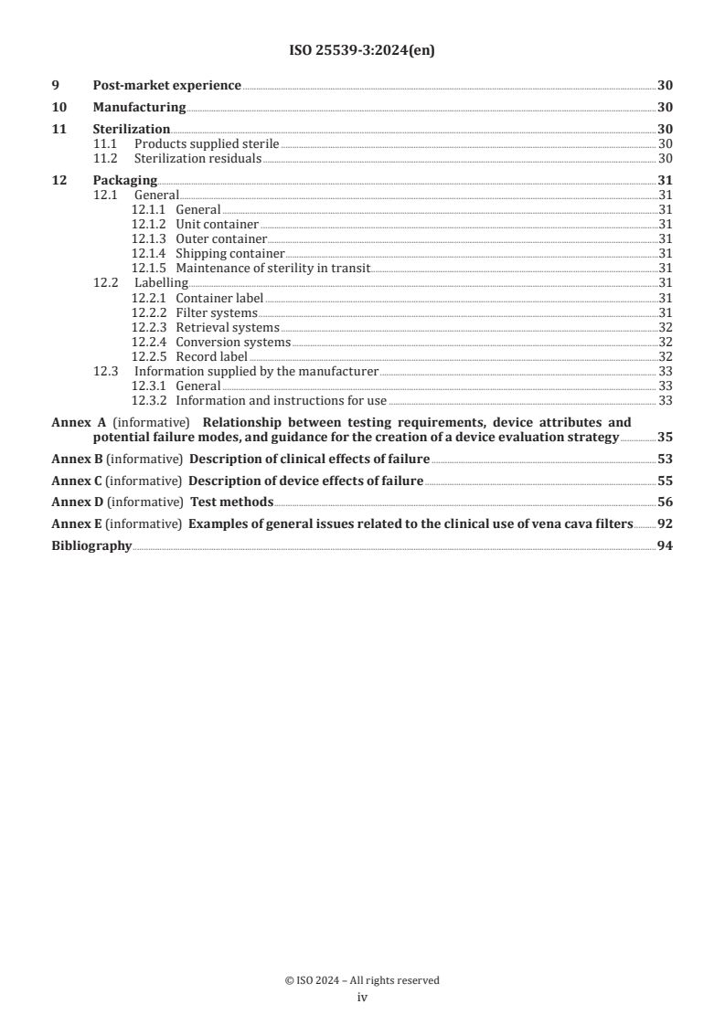 ISO 25539-3:2024 is a standard published by the International Organization for Standardization (ISO). Its full title is "Cardiovascular implants - Endovascular devices - Part 3: Vena cava filters". This standard covers: This document specifies the requirements for the evaluation of vena cava filter systems (filters and delivery systems) and the requirements with respect to nomenclature, design attributes and information supplied by the manufacturer. Guidance for the development of in vitro test methods is included in Annex D. This document is intended to be used in conjunction with ISO 14630, which specifies general requirements for the performance of non-active surgical implants. NOTE 1 Due to the variations in the design of implants covered by this document, and in some cases due to the emergence of novel types of such implants, acceptable standardized in vitro tests and clinical results are not always available. As further scientific and clinical data become available, a revision of this document will be necessary. This document is applicable to vena cava filters intended to prevent symptomatic pulmonary embolism by capturing blood clots in the inferior vena cava (IVC). While this document can be useful with respect to filters implanted in other venous locations (e.g. superior vena cava, iliac veins), it does not specifically address the use of filters in other implantation sites. This document is also applicable to permanent filters together with their associated delivery systems, optional filters that can be retrieved and their associated retrieval systems, and convertible filters and their associated conversion systems. While this document can be useful with respect to the evaluation of repositioning filters after chronic implantation, it does not specifically address filter repositioning. This document is not applicable to - temporary filters (e.g. tethered) that need to be removed after a defined period of time, - issues associated with viable tissues and non-viable biological materials, and - procedures and devices (e.g. venous entry needle) used prior to the vena cava filter procedure. Although absorbable filters and filters with absorbable coatings are within the scope of this document, this document is not comprehensive with respect to the absorbable properties of these devices. NOTE 2 Absorbable implants are covered in ISO/TS 17137. Although coated filters and coated filter systems are within the scope of this document, this document is not comprehensive with respect to coatings. NOTE 3 Vascular device-drug combination products are covered in ISO 12417-1 and some coating properties are covered in ISO 25539-4.