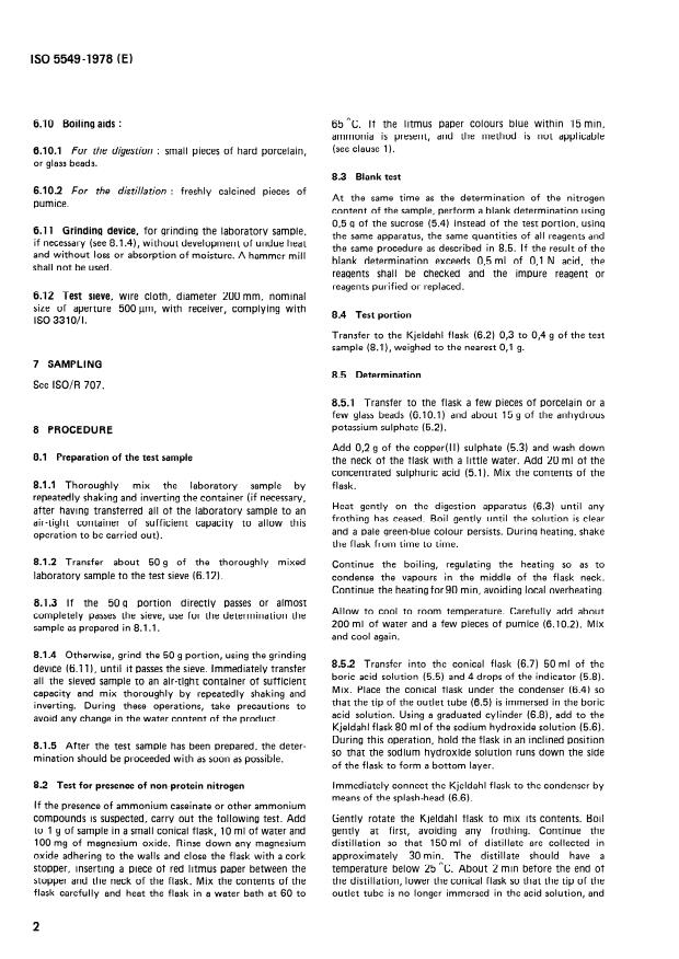 ISO 5549:1978 is a standard published by the International Organization for Standardization (ISO). Its full title is "Caseins and caseinates — Determination of protein content (Reference method)". This standard covers: Does not apply to caseins and caseinates containing ammonium caseinate or other ammonium compounds, or other nitrogenous nonprotein compounds. The principle of determination consists in digesting a test portion with a mixture of potassium sulphate and sulphuric acid, in the presence of copper(II) sulphate as catalyst, to convert organic nitrogen into ammoniacal nitrogen, distilling and absorbing the ammonia in boric acid solution, titrating with standard volumetric hydrochloric acid solution and multiplying the resualt by the factor 6.38.