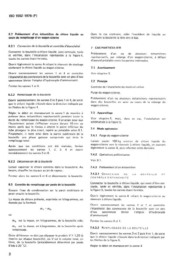ISO 1552:1976 is a standard published by the International Organization for Standardization (ISO). Its full title is "Liquid chlorine for industrial use - Method of sampling (for determining only the volumetric chlorine content)". This standard covers: The method is applicable when an agreement has previously been reached between the interested parties for the removal of two representative samples during filling of the tank-wagon at the manufacturer's premises. It cannot be applied when it is intended to determine the water content. The principle consists in checking that the equipment used is gas-tight; collection of the samples in steel bottles. One bottle is intended for the customer and the other is retained by the manufacturer in case an analysis is required for checking purposes. - Replaces ISO Recommendation R 1552-1970.