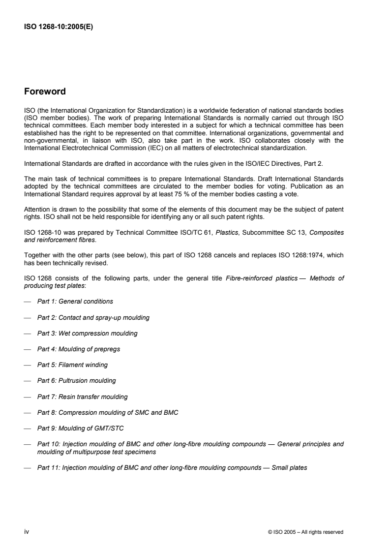 ISO 1268-10:2005 - Fibre-reinforced plastics — Methods of producing test plates — Part 10: Injection moulding of BMC and other long-fibre moulding compounds — General principles and moulding of multipurpose test specimens Released:4. 02. 2005