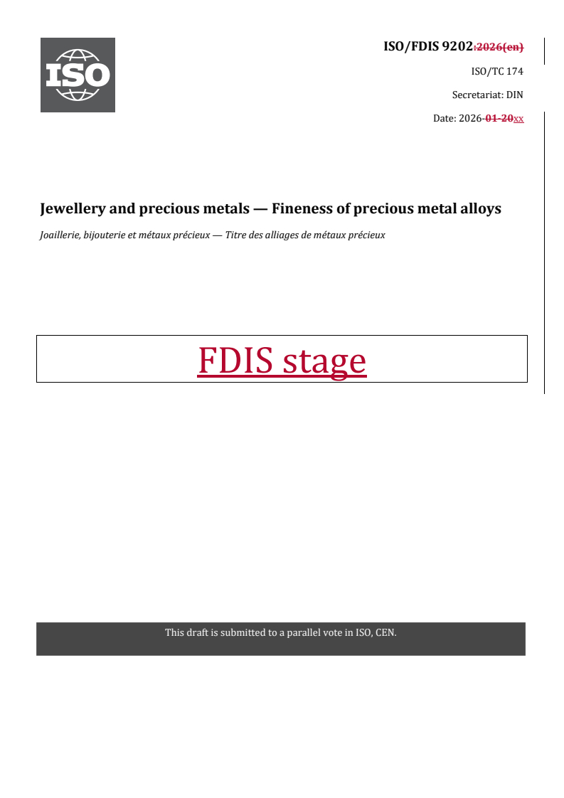 ISO/FDIS 9202 - Jewellery and precious metals — Fineness of precious metal alloys Released:6. 02. 2026