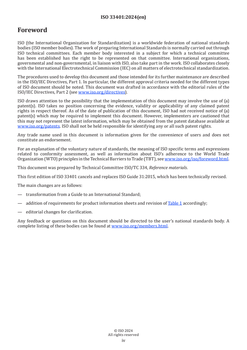 ISO 33401:2024 is a standard published by the International Organization for Standardization (ISO). Its full title is "Reference materials - Contents of certificates, labels and accompanying documentation". This standard covers: This document is intended to help reference material producers (RMPs) in preparing clear and concise documentation to accompany a reference material (RM). It lists and explains mandatory, recommended and other categories of information to be considered in the preparation of product information sheets and RM certificates. This information can be used by RM users and other stakeholders in confirming the suitability of an RM or certified reference material (CRM). This document also contains the minimum requirements for a label attached to the container of an individual RM unit.