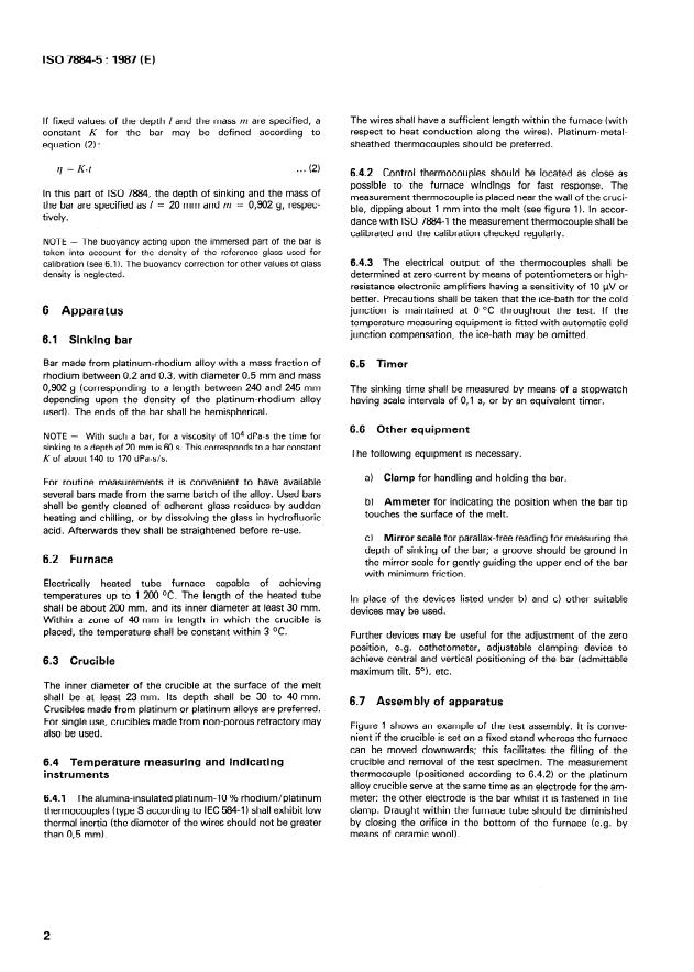 ISO 7884-5:1987 is a standard published by the International Organization for Standardization (ISO). Its full title is "Glass - Viscosity and viscometric fixed points - Part 5: Determination of working point by sinking bar viscometer". This standard covers: The specified method is suitable for characterizing the low-viscosity range of glass working: A vertically positioned narrow metal rod, i.e. the bar, is allowed to sink under its own weight into the melt. From the rate of sinking the dynamic viscosity is calculated. The teoretical basis relation and the apparatus including method of measurements are described.